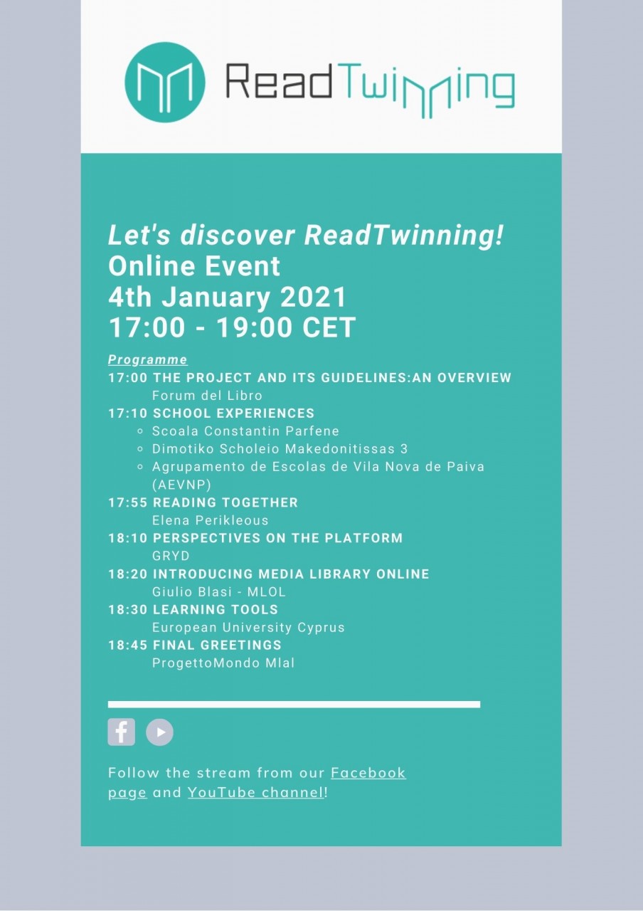 Organizzato dal Forum del Libro insieme ai partner europei (Scoala Gimnaziala "Constantin Parfene", Romania; Dimotiko Scholeio Makedonitissas 3 – Stylianou Lena, Cipro; Grupamento de Escolas de Vila Nova de Paiva, Portogallo; GRYD, Regno Unito; European University Cyprus, Cipro;e ProgettoMondo Mlal, Italia), l'incontro – in lingua inglese – sarà visibile sulla pagina Facebook e sul canale YouTube del progetto.